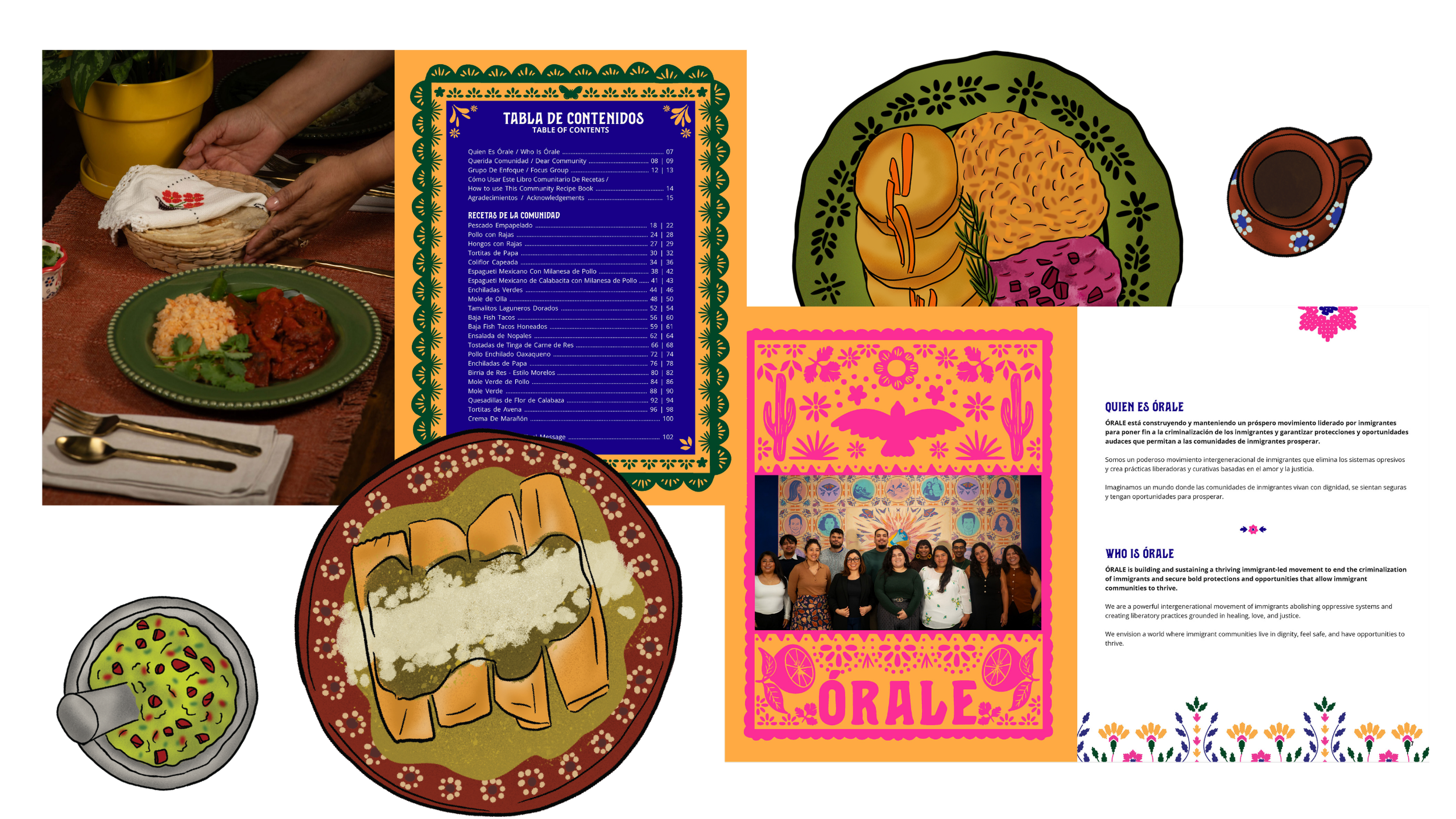 Food is culture, memory, and community. We designed a warm, bilingual cookbook for Órale, celebrating community recipes alongside the stories and people behind them. Each spread pairs a chef's narrative with their signature dish, featuring bilingual English and Spanish throughout. Custom illustrations, community photography, and chef bios bring the cultural significance of each recipe to life in a publication that's as inviting as it is professional.