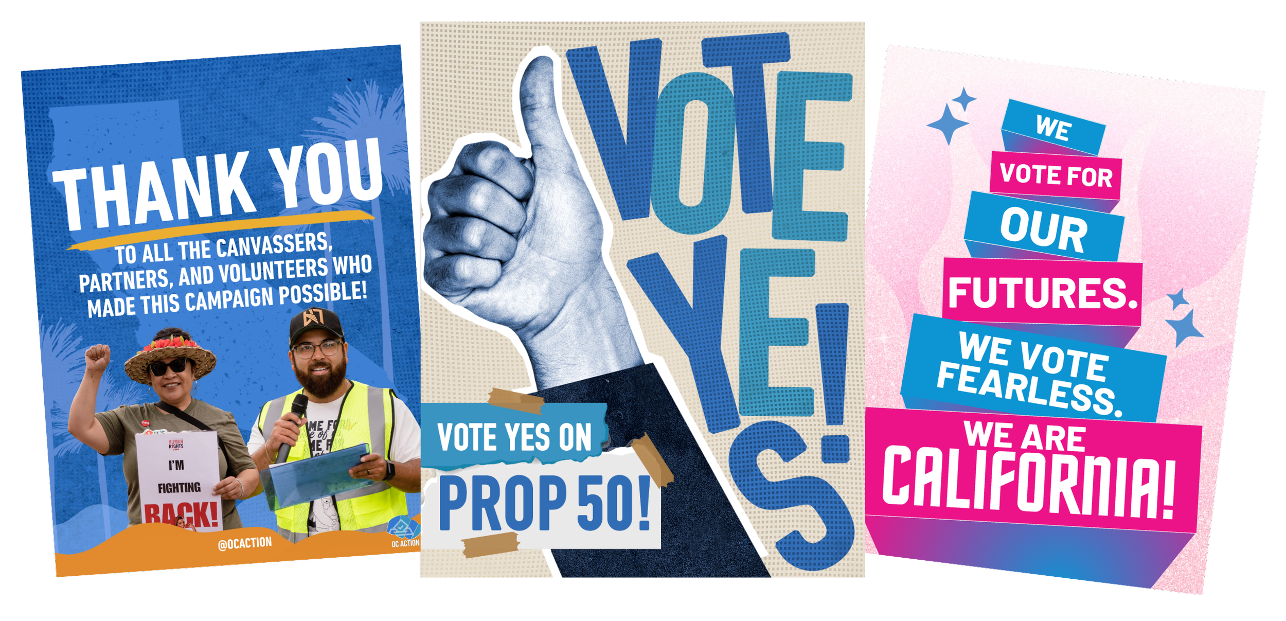 Elections are won in the margins. We partnered with OC Action to create voter education content, Prop 50 graphics, and community engagement assets rooted in the realities of Orange County's underrepresented communities. Every piece was built to inform, activate, and celebrate — from early education through election night.