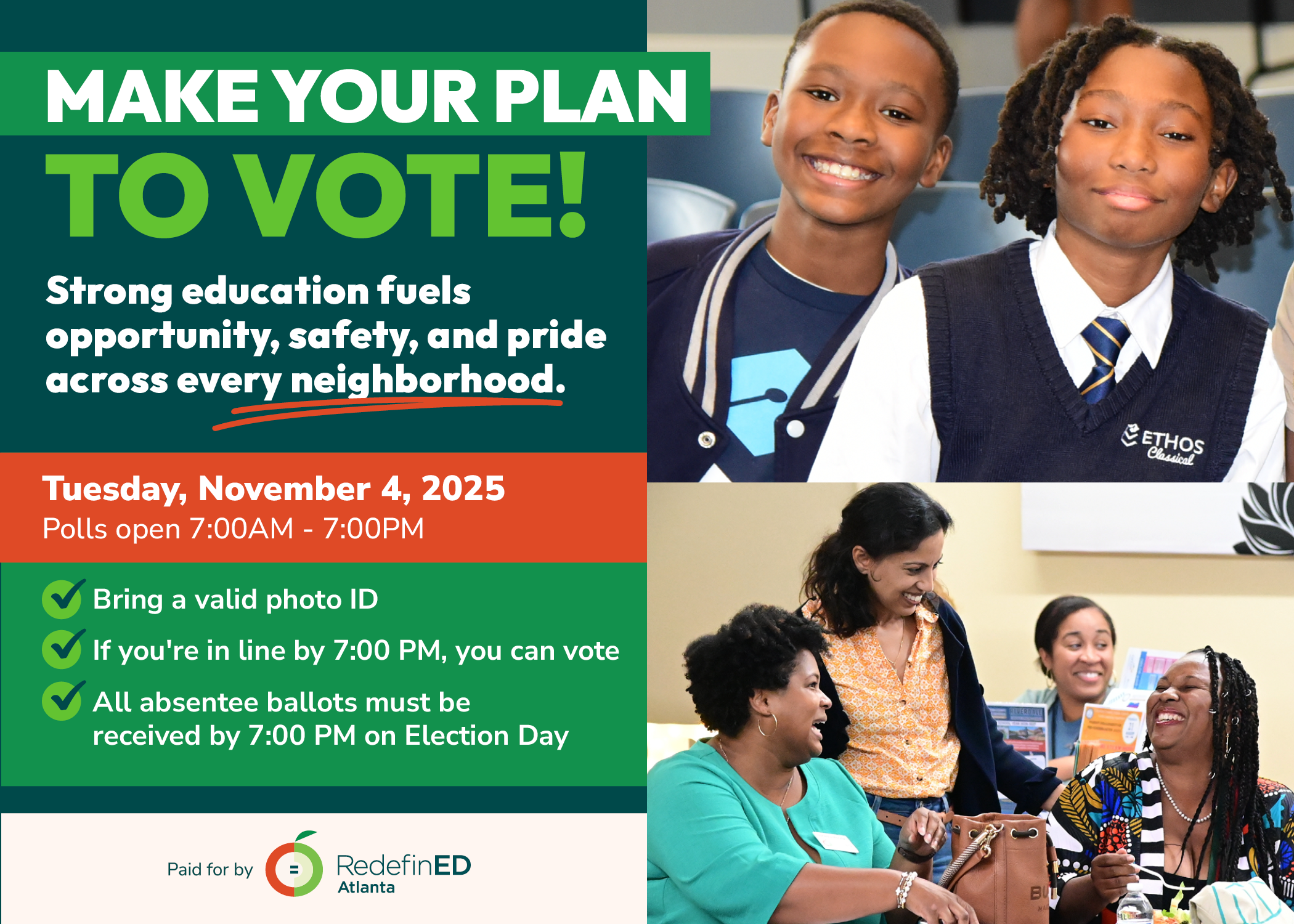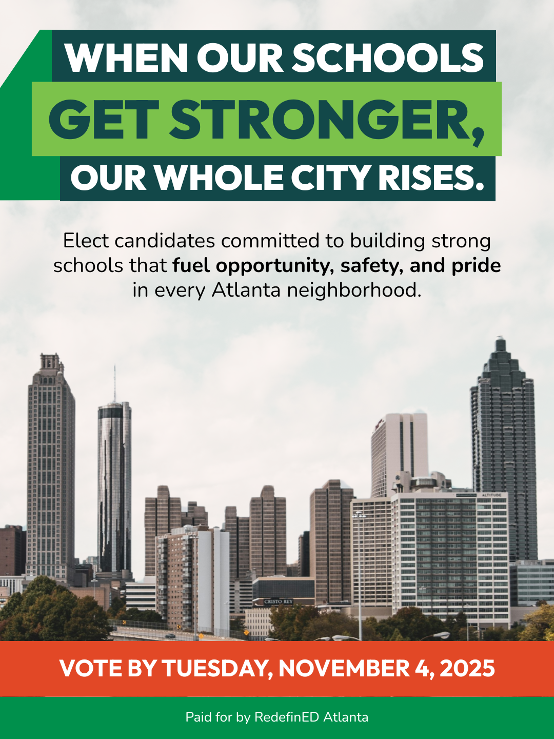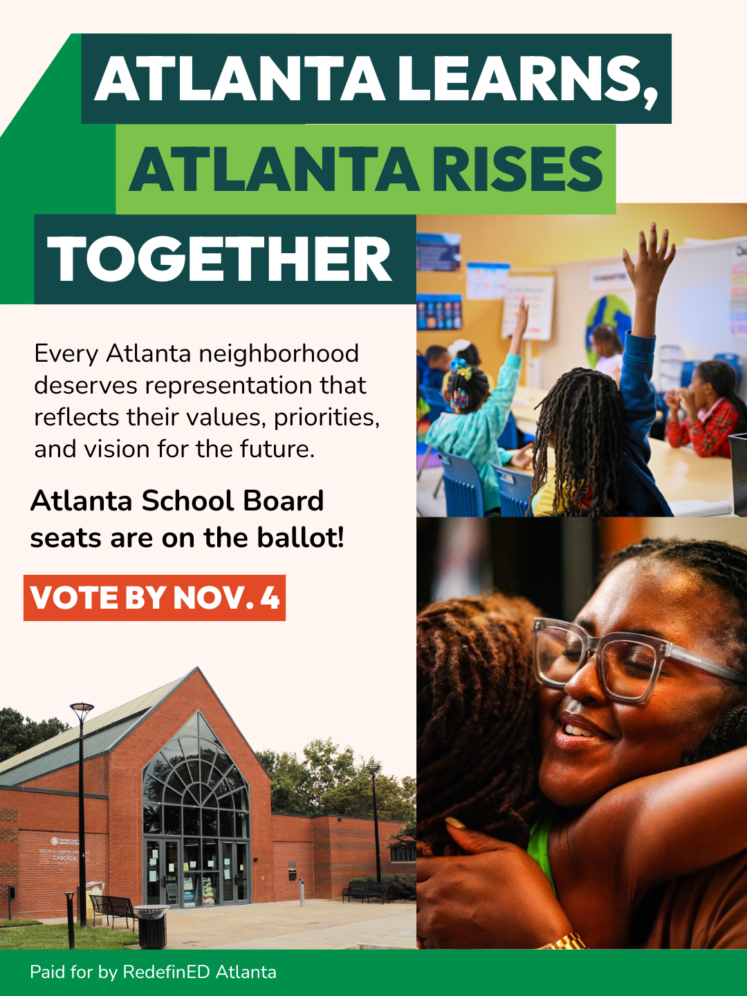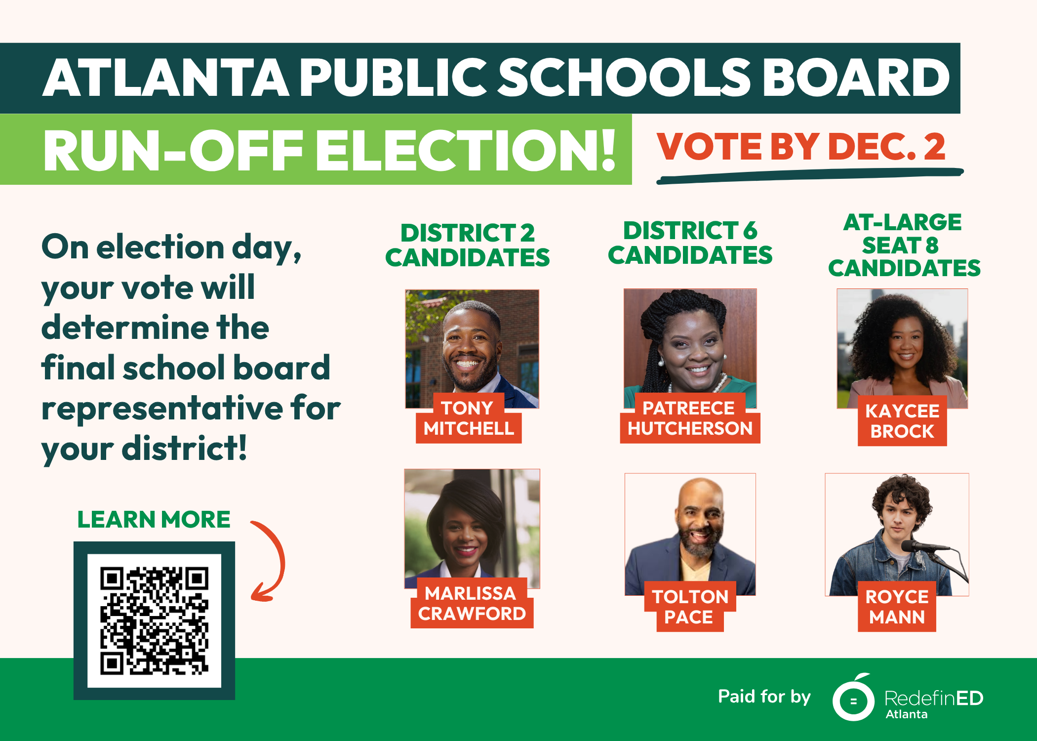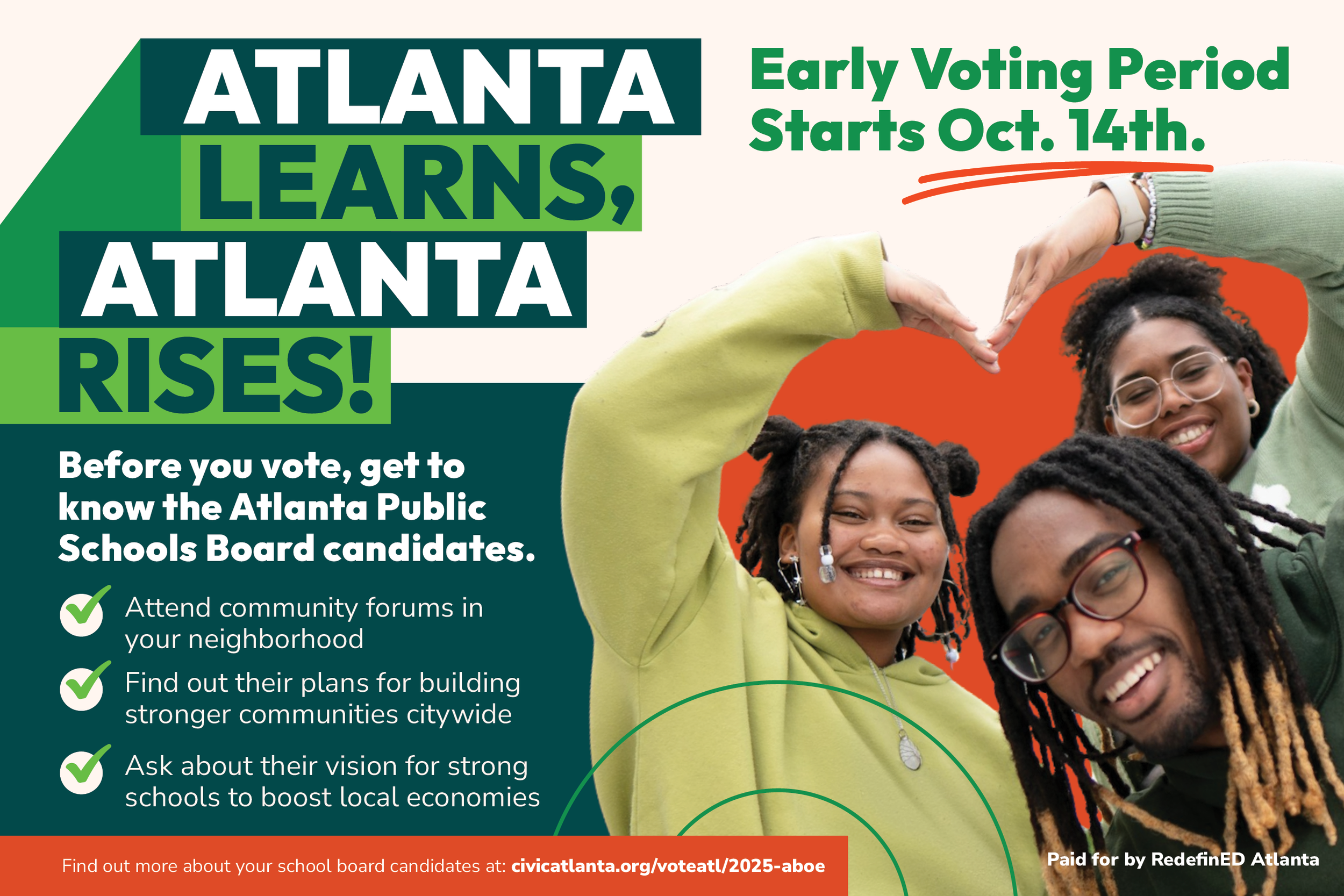 Ads management and creative development for social media, voter informational documents, and direct mail for the 2025 Atlanta School Board elections, including the runoff election.